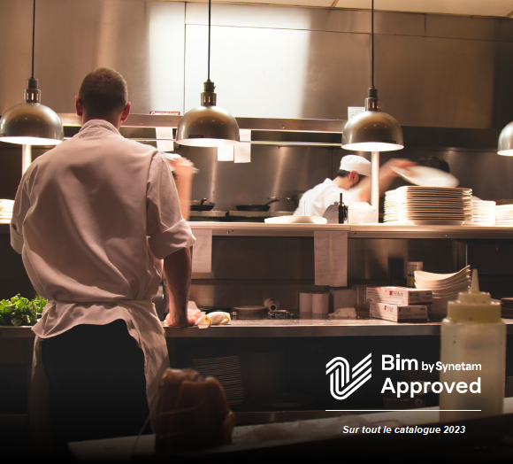 Appliqué à la filière des cuisines professionnelles, le BIM repose sur la mise à disposition, par les fabricants, auprès des architectes, bureaux d’études et installateurs, d’objets 2D et/ou 3D de l’équipement des cuisines professionnelles qui vont venir s’insérer dans la maquette numérique du chantier. Ces objets BIM – par ex. un four, une laveuse, une armoire de conservation… – incluent à la fois des données géométriques (dimensions) et des données technico-commerciales (modèle, alimentation, connecteurs…).